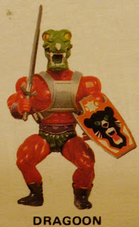 It is interesting to note that the image from the Beast of Ferror box (above) shows Huk's beard as blonde and Dragoon with a green head that is different then the head he was actually produced with. These are probably prototype figures, and it can be assumed that this image was compiled before final changes where made to the appearances of Huk and Dragoon. For the final release, Huk's beard was made red and his helmet was made brown. Dragoon's head was made red to match his body, and he was given horns.