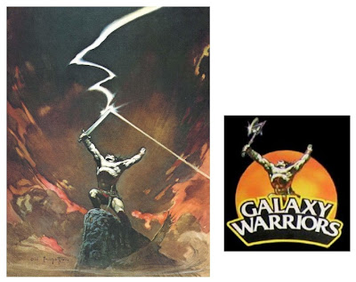 The cropped form used for the Galaxy Warriors logo has been given an axe instead of a sword. Minor differences in how shadows highlight the figure make me believe that the logo image was not a direct photocopy of the Frazetta image, but it was instead a "knockoff" painting done to copy Frazetta's work as closely as possible. Whether it was a touched-up photocopy or a "new" painting, it is undeniable that the Galaxy Warrior logo comes from this Frazetta painting.