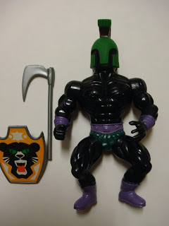 Spikes has a great design that is simple yet awesome. Without the black body this figure would lose some of its power. The black allows us to imagine that hidden under this helmet is the face of a brutal and fearsome warrior. If the areas of the head that are not covered by the helmet were any other color, then the head sculpt would lose this effect. The Spikes figure pictured is not wearing a harness simply because he looks cooler without one.